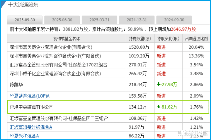 在梳理全案时,财官注意到一个不容忽视的资金面动向:作为重要长期投资者的香港中央结算有限公司(代表北向资金),在近期进行了大幅度的仓位调整,其持股比例减少了38%。