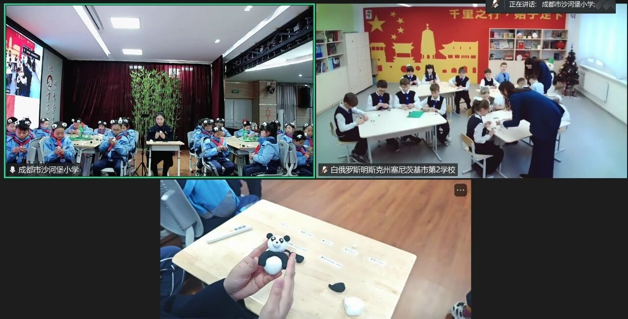签约仪式后,“熊猫走世界”线上文化课程温情启幕。沙河堡小学老师陈曦带领中、白双方学子,开启了一场以超轻粘土为载体的创意邂逅。孩子们全情投入创作,积极互动交流,一件件充满童趣的作品见证着文化的碰撞与交融。作品展示环节,两国孩子纷纷举起作品,夸赞彼此的创作——“熊猫很可爱”、“颜色真好看”……屏幕两端的点赞与欢笑,让文化差异化作友谊的催化剂,熊猫玩偶成为中白少年友谊的具象象征。